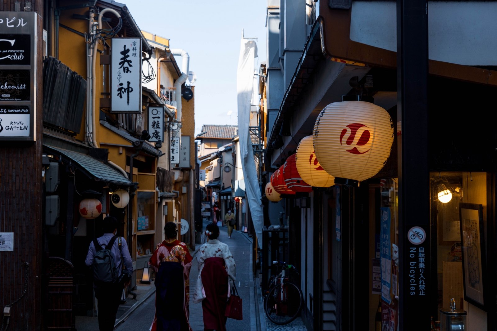 Por la noche, dirígete a Pontocho, una calle estrecha junto al río donde los faroles iluminan las fachadas de madera.